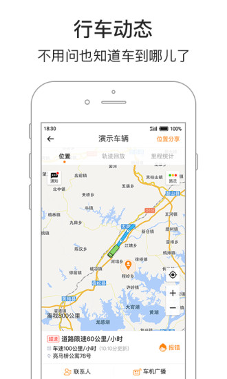 6、行车动态:用户可在此查看自己名下车辆的行车实时位置、运行轨迹、超速报警、里程统计信息。
