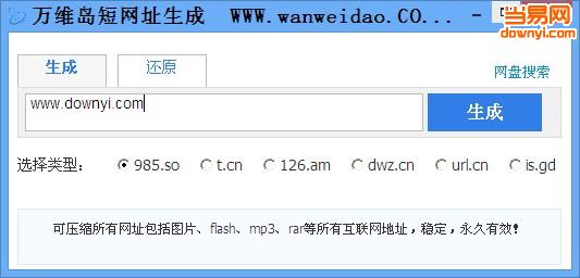 万维岛短网址生成器,是一个快速生成短网址的软件,集成985.so,t.cn,126.am,dwz.cn,url.cn,is.gd的短网址生成和还原功能.万维岛短网址生成工具可压缩所有网址包括图片、flash、mp3、rar等所有互联网地址,集成多家网址缩短域名接口,快速压缩网站!支持短网址还原。