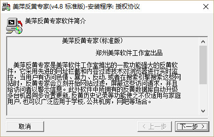 美萍反黄专家是美萍软件工作室推出的一款功能强大的反黄软件,它采用先进的网址拦截和内容过滤技术对浏览器进行实时监控,当用户有访问色情、暴 力、反动或者在搜索引擎搜索这些网站时,反黄专家会立刻开始网站过滤,屏蔽这些访问请求,并且给访问者以警示信息。此外软件中所拥有的反黄数据库自动升级,多台机器同步设置更新,反黄历史记录等功能使之不仅适用与家庭用户 ,也可以广泛应用于学校、公共机房、网吧等场合。