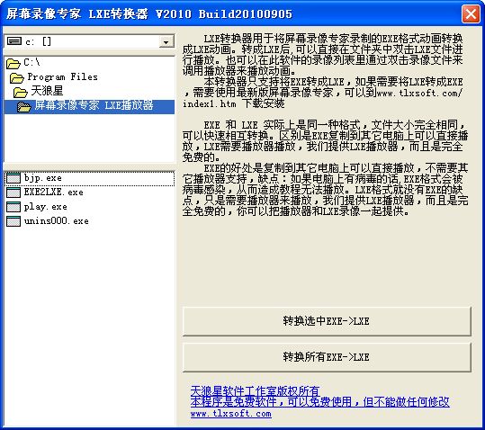 《LXE播放器》是免费软件,用于播放屏幕录像专家录制的LXE和EXE格式的录像文件,安装后将自动关联LXE格式文件,通过双击LXE文件就可以自动调用此播放器进行播放。