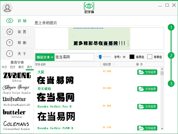 识字体软件是全球首款图片识别字体软件,由字客网独立研发,界面简约清新,操作简单,支持多种字体,轻松一步就能搞定字体识别。有需要的朋友快来试用吧!