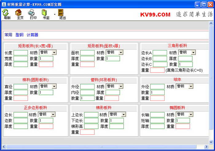 材料重量计算是一款用于计算机物质重量的软件,可以计算包括钢板、方钢、圆钢、圆管、角钢、槽钢、工字钢、六角钢、八角钢、方管等12个类别材料重量,可以提高材料重量计算速度。