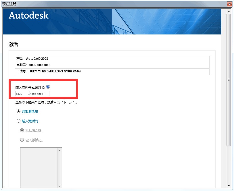 4.下方选择:“输入激活码”,并将注册机得到的激活码粘贴到下方的框框中