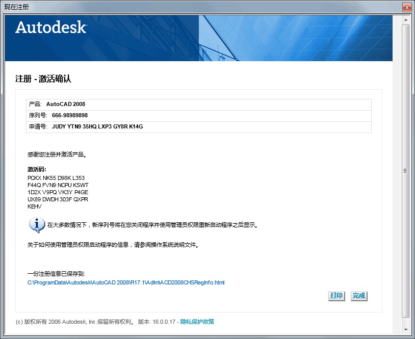 5.点“下一步”,成功完成AutoCAD 2008的修改激活