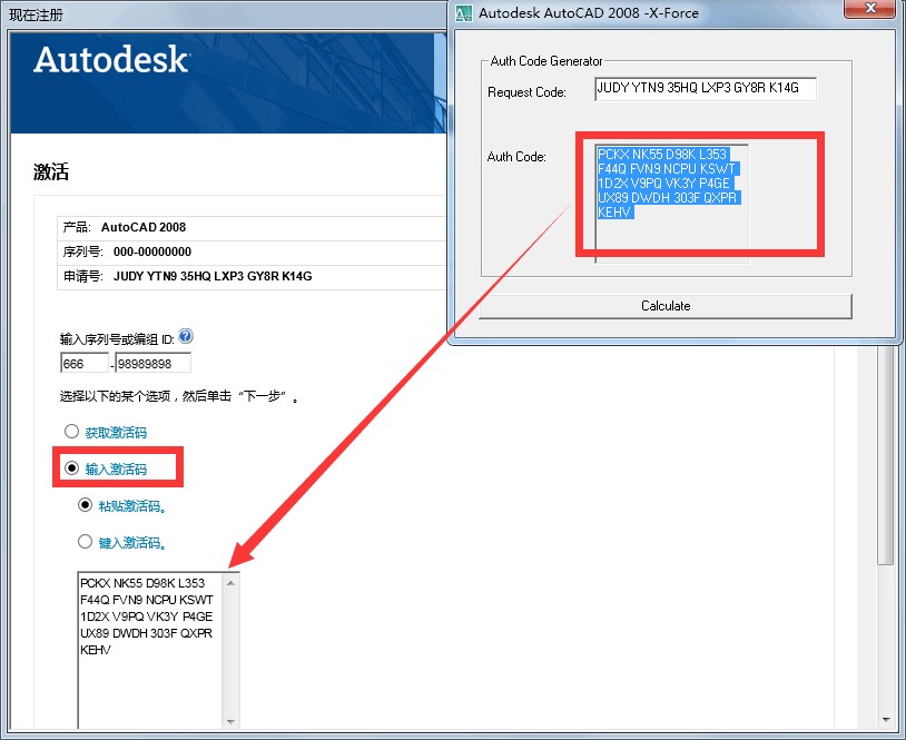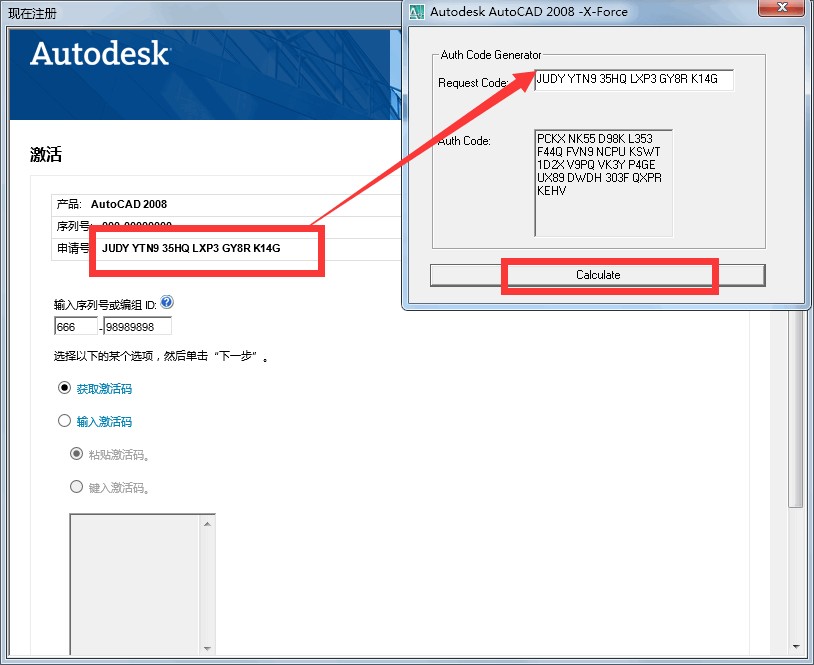 3.压缩包内提供了注册机,注册机只能在AutoCAD 2008启动后才可以打开!将申请号粘贴到注册机中,然后点击下方的 “Calculate”按钮,下面 Auth Code 一栏就是得到的授权号