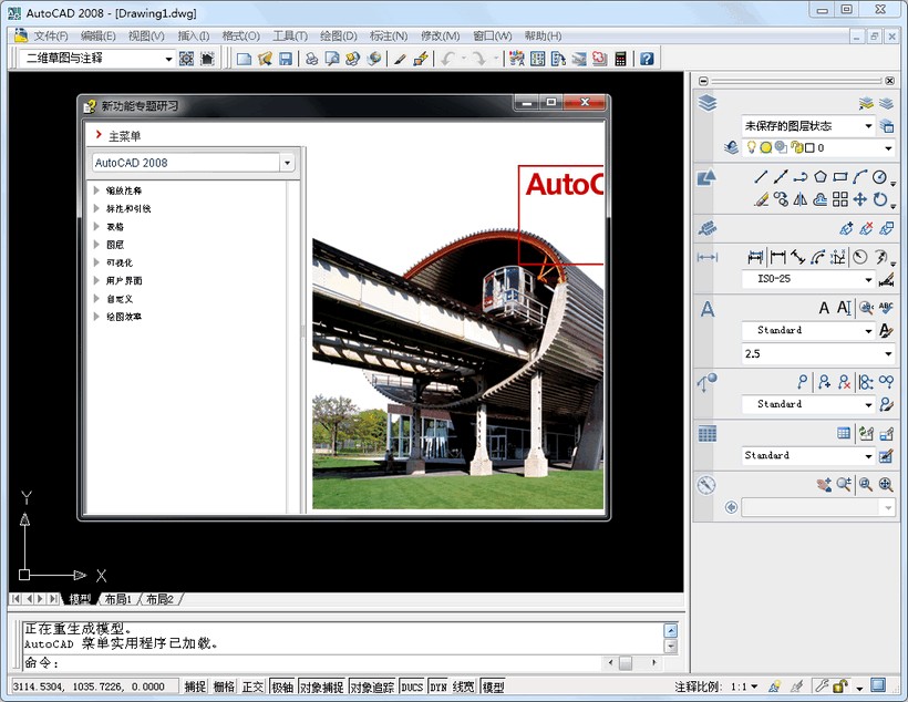 AutoCAD 2008是在原先的CAD软件基础上,在界面、工作空间、面板、选项板、图形管理、图层、标注等到方面进行了更改时宜,增加和增强了部分功能,使CAD在功能方面更加完善和实用。