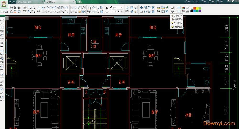 5、齐全的cad浏览编辑:包括平移缩放、全图框选、复制剪切、布局图层、颜色线型、捕捉文字、填充等。