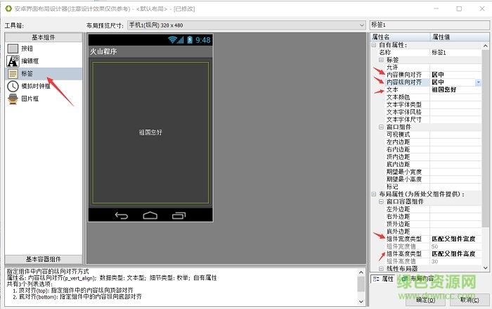 6.将“标签”从左侧工具箱中拖入设计预览窗口中,然后填写图中箭头所指向的属性内容: