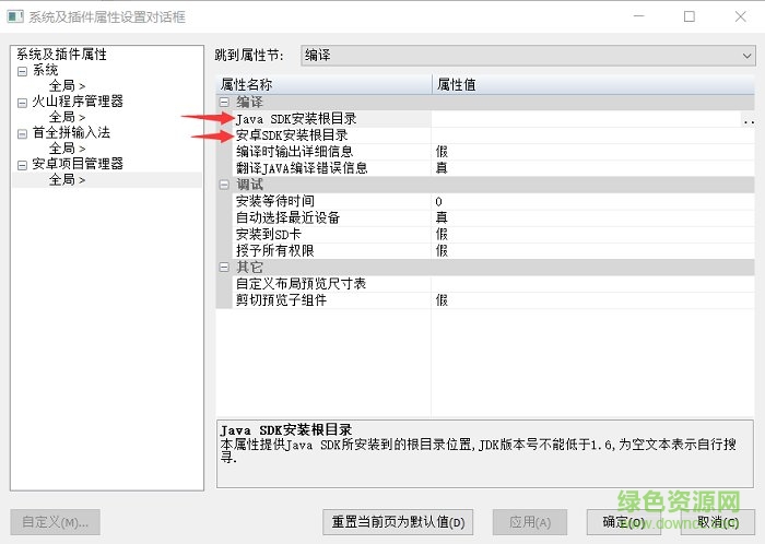 如果不愿意下载,您也可以选择将我们提供的SDK整合压缩包直接解压到火山平台安装目录的“pluginsvprj_android”子目录下即可(此时请保持相关属性项为空)。