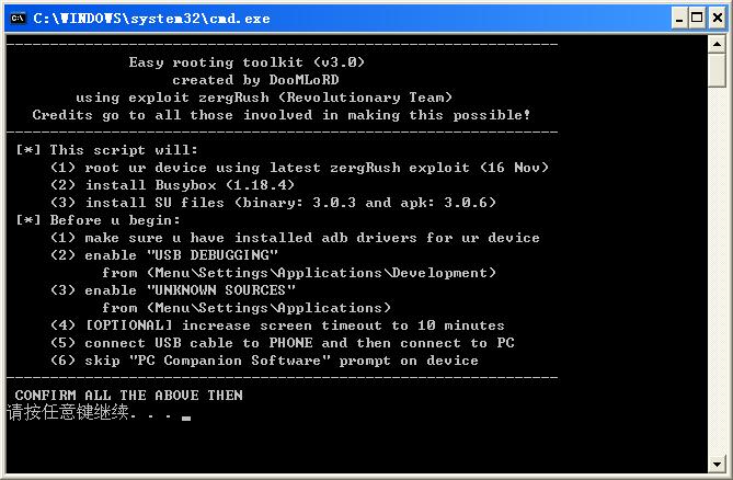 按任意键开始 ,等结束,按任意键自动关闭程序 ROOT完成 手机会自动重启