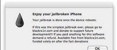 第三步:你的iPhone或iPod Touch将进入恢复模式(如果没有进入,手动进入试试),这时iPhone或iPod Touch屏幕上会显示GeoHot的头像。黑雨blackra1n将继续运行,你的iPhone或iPod Touch将重新启动。等待重启,如果出现下面画面在电脑上,点OK,继续等待iPhone或iPod Touch重启。