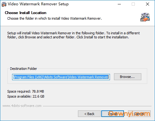 3、选择软件安装的目的地,默认的是“c:program files (x86)4dots softwarevideo watermark remover”,如需修改点browse,确认安装信息无误,点击install