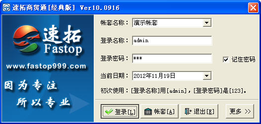 速拓商贸通是面向需要双单位换算的商品零售、批发、进销存管理的客户所开发的一款软件,支持双单位换算、进销存管理、会员管理、送货提醒、库存积压、脱销报警等功能。