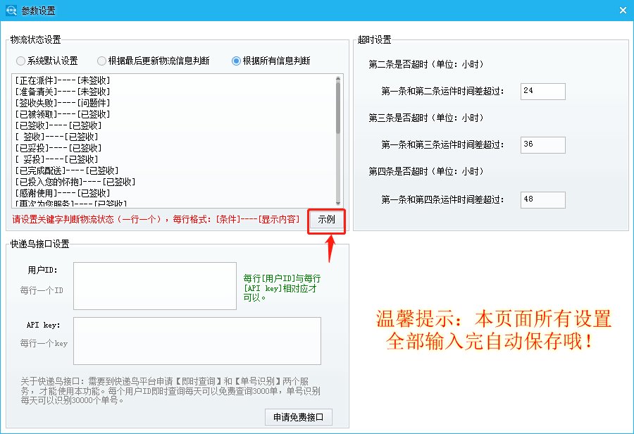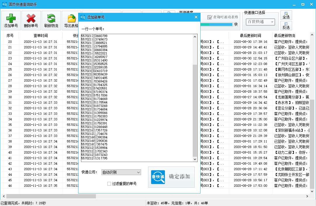 非常专业的快递物流单号运件信息批量查询软件。该软件支持几百家国内外常用快递、物流查询,包括菜鸟裹裹、快递100、中通速递、京东物流等,极速自动识别快递单号,多种导入导出方式,多种查询接口!
