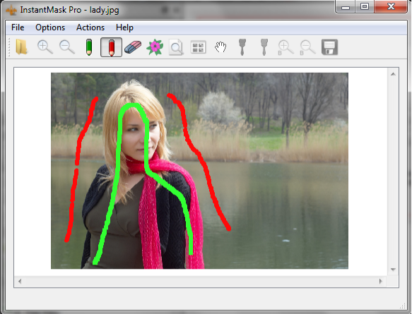 虽然是英文版的软件,但是InstantMask 的使用方法确实非常简单。首先,你要把照片添加到软件中,然后用红色来标记出照片的背景部分,用绿色来标明前景,点击预览按钮就可以看到效果了。