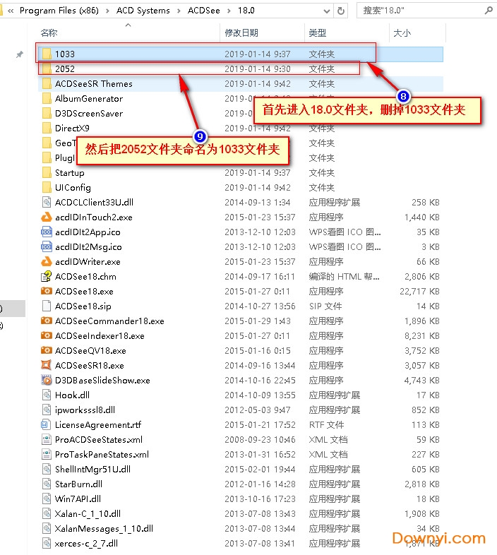 8.9步,进入18.0文件夹,如图所示,删除1033文件夹,把2052文件夹改名为1033文件夹: