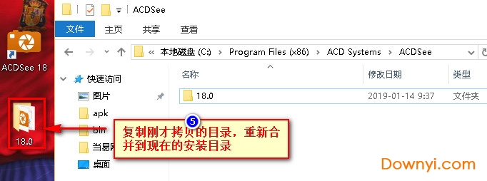 5.完成之后,打开acdsee18安装路径c:program files (x86)acd systemsacdsee,然后将刚才桌面上拷贝的18.0文件夹和现在的目录进行合并,如图: