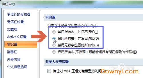 6、在宏设置选项卡中有几个禁用宏的选项,可以选择禁用后是否发出通知、是否只禁用无数字签署的宏。根据情况,点击选择需要的选项。