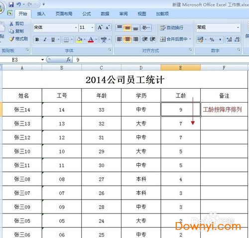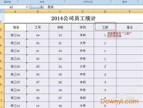 7、可以看到表格中已经按主要关键字“工龄”的降序进行排序了。同样,我们也可以设置按“学历”的升序或“降序”来排列,设置同上。本表也可以将“姓名”或“年龄”设置为“主要关键字”,有兴趣的话可以自己操作下。