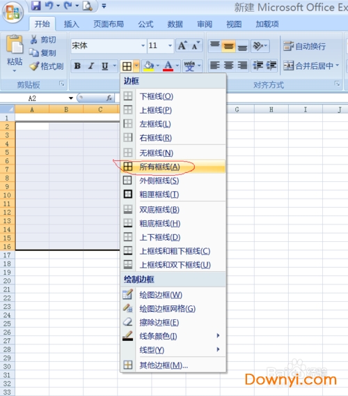 5、选中之后,点击边框里的所有框线,如下图,就把所有单元格填上线了;