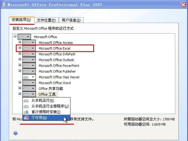 3.在“安装选项”这栏把其他office组件都去掉,只留excel2007(如图框起来的地方)。当然,如果你需要其他组件也可以一起安装,可以根据需求选择安装的组件。