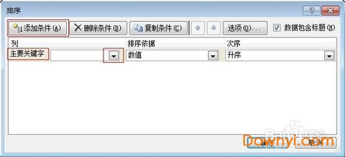 3、这时弹出来“排序”对话框,在“列”项下默认出现“主要关键字”。如果需要按多种条件排序的话,可以点击“添加条件”,“列”项下会对应出现“次要关键字”。