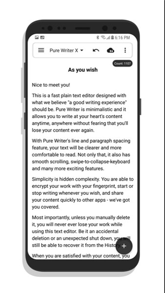 致力于提供绝不丢失内容、快速、优秀写作体验的app。在源于全世界用户对于纯纯写作的评论中,有许多用户对纯纯写作给予了夸张的赞赏,比如「没用过这么好用的app」、「这真的是我用过最舒服的写作app了」、「很好用,彻底改变我用纸笔写作的习惯」、「忍不住想夸你,这个应用真的好棒,正因为你们这样的开发者在,android才会这么精彩」...