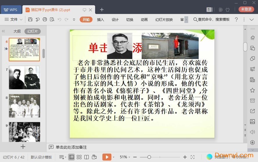 人民艺术家——老舍,原名舒庆春,字舍予,着名作家。1899年生于北京。正红旗人,满族。“五四”时期开始新文学创作。作品有:《老张的哲学》、《赵子日》、《二马》、《猫城记》、《离婚》、《牛天赐传》、《月牙儿》、《骆驼祥子》、《四世同堂》等。