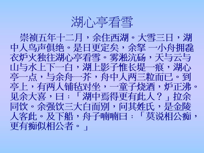 文章以精炼的笔墨,记叙了作者自己湖心亭看雪的经过,描绘了所看到的幽静深远、洁白广阔的雪景图,表现了作者孤独寂寞的心境和淡淡的愁绪。突出了作者遗世独立、卓然不群的高雅情趣。