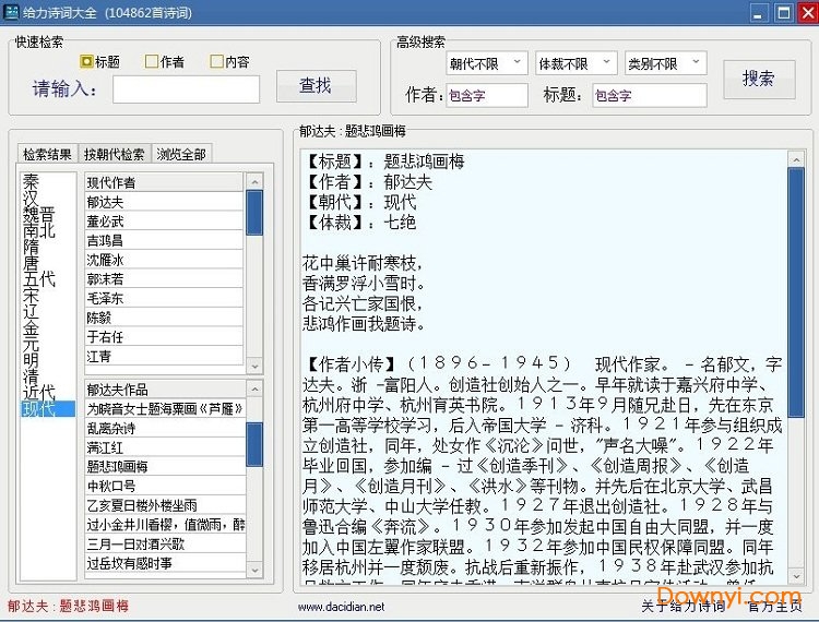 诗词大全给力版为绿色免费软件,收录诗词104862首,包括了先秦至现代五千余位中国著名诗词作家的代表作品。诗词大全给力版是一个学习充电的好工具。