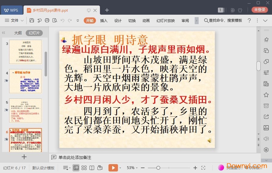乡村四月ppt课件为你在学习这首诗词的时候为你提供更多的知识内容。课件中从多个方面讲解了这首诗的内容、结构、背景等,让同学们对其有一个不错的理解!