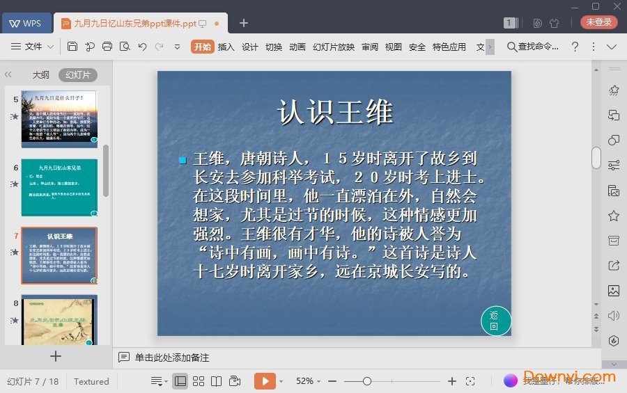 九月九日忆山东兄弟ppt课件为同学们讲解其中的内容故事,让你在学习中了解这首诗的含义以及相应的重点内容,让你在学习中体会王维的这首诗。欢迎来下载学习使用!