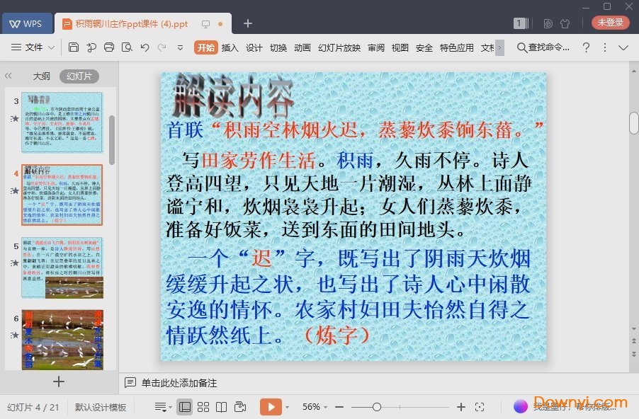 积雨辋川庄作ppt课件为你在学习这篇诗文的时候提供比价不错的作用。这篇古诗也是考试中经常出现的,所以重中之重的内容在课件中都有讲解。欢迎来体验学习!