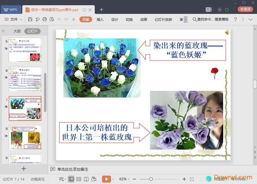 送你一束转基因花ppt课件为同学们学习提供方便的使用工具,通过这款课件可以让你了解更多有意思的内容。课件内容较多,虽然不会详细讲解转基因技术,但是了解还是可以的。欢迎来体验!