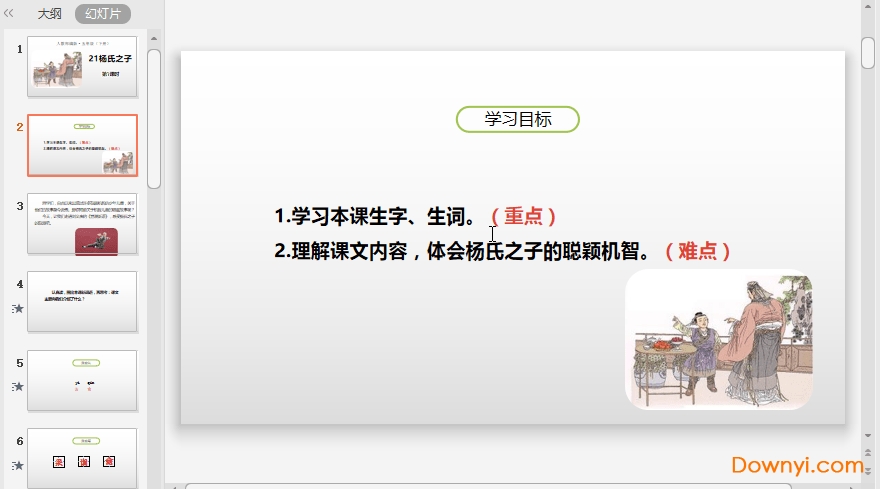 五年级下册杨氏之子ppt课件很好的将课文里面的重难点进行了规划,老师们也不用再去伤脑筋制作ppt了,直接拿过来就可以用,学生也可以得到很好的教学内容,何乐而不为呢?