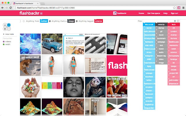 Flashbackr 是捕获和组织在线内容(文章、图片、YouTube 视频、推文等)和离线内容(任何类型的文件:文档、音乐等)的最简单方法。Flashbackr 独特的标记系统使所有对您重要的内容保持整洁,并且搜索速度极快。所有保存的项目都可以从您的 flashbackr.com 私人帐户上的任何设备在线查看。