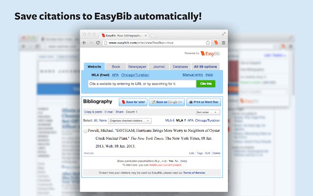 EasyBib 是世界上最大的书目制造商和引文机器。我们的 EasyBib 工具栏可让您一键引用网站。接收有关您引用的站可信度的建议。尽可能多地引用您需要的来源,以构建完全格式化、按字母顺序排列且支持文字处理器的参考书目。