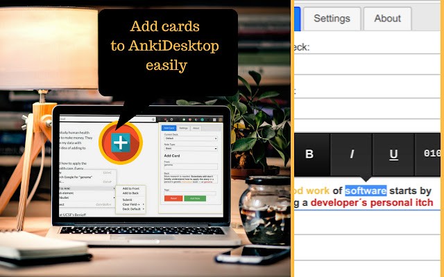 此扩展程序提供了直接从 Anki 桌面上的 Google Chrome 创建 anki 卡片的功能。