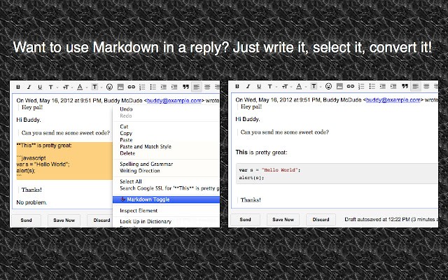 Markdown Here允许你在发送电子邮件之前用Markdown语法编辑并转换它(让它看起来漂亮极了!)。