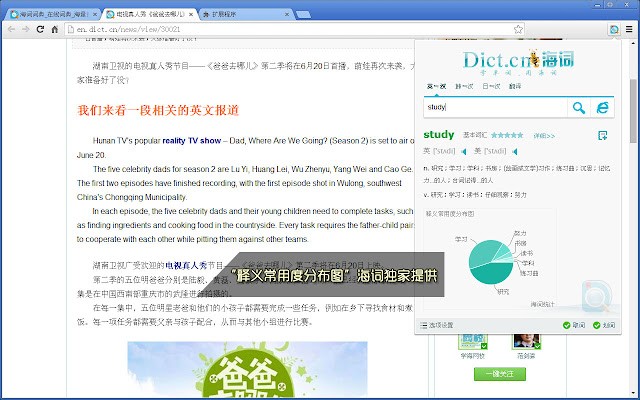 海词词典支持在Chrome浏览器中实现鼠标取词、划词翻译。可在查看浏览器网页时快捷的帮助翻译陌生的单词。使用海词词典可快速查询单词,获得海词提供英汉、汉英等全面、专业、权威释义内容;“释义常用度分布图”可让释义一幕了然。