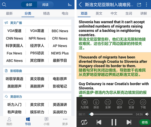 1、海量内容:3000优质英语节目,语音同步双语字幕,超过30万篇有声资源;