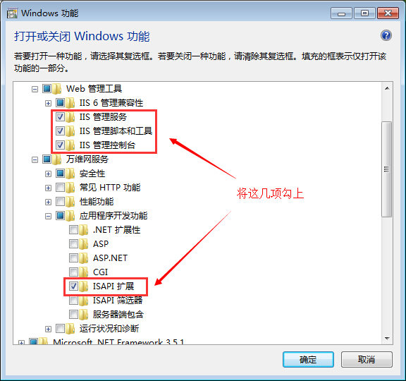 3.将iis管理服务、iis管理脚本和工具、iis管理控制台、isapi扩展前面的勾勾上,最后确定即可。以上操作完成后就可以成功安装360主机卫士啦。