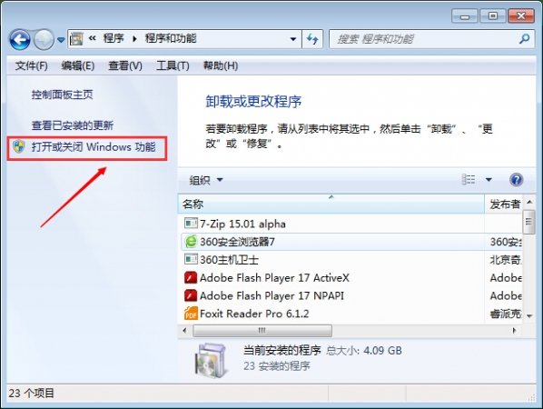 2.在左侧找到程序和功能--打开或关闭windows功能