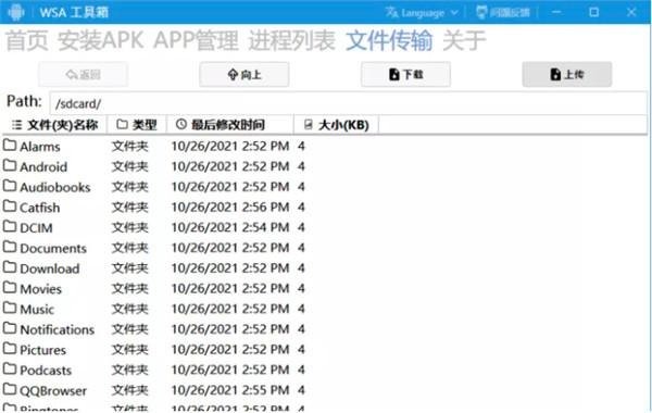 6、WAS工具箱还有一个好用的功能,那就是打通安卓子系统与windows系统之间的文件传输通道,让用户可以将安卓子系统 里的文件取出到Windows系统文件目录下,也可以将Windows系统文件传输到安卓子系统中去。