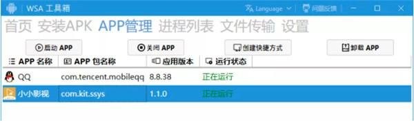 4、也能在WSA工具箱 - APP管理 - 管理所有安装的安卓应用的 开启、关闭、卸载 创建快捷方式等。