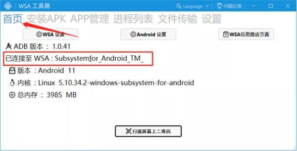 2、如果软件提示:已连接至WSA,则你就能用WSA工具箱任性安装安卓.apk文件了!如若不能,请检查开发人员模式是否打 开,或者填入备用IP地址。