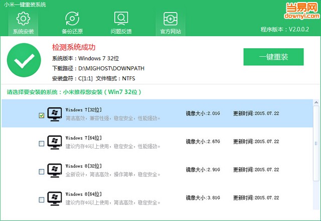小米一键重装系统是无需任何技术就可以完成的电脑重装系统软件,使用小米一键重装系统,只需简单几步流水线选择操作即可完成电脑重装。自动检测分析当前电脑信息,不强制安装同时保证安装后系统的正常使用性。内置xp和win7(32/64)系统提供用户选择重装系统版本。本软件支持多数Windows版本,用户可放心使用。
