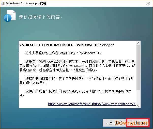 2、双击“Windows 10 Manager v3.0.5.exe”开始安装,用户协议界面,下一步;