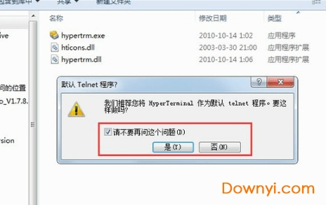 3、双击打开hypertrm.exe程序,会有一个是否默认的选中项,自行决定,或勾选“请不要再问这个问题”之后再选择(是或否)。