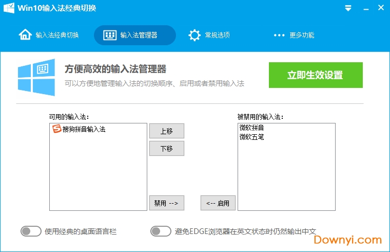 轻松查看系统上安装的输入法个数、输入法的顺序以及被禁用的输入法。启用或禁用已经安装的输入法,以及调整输入法的顺序。